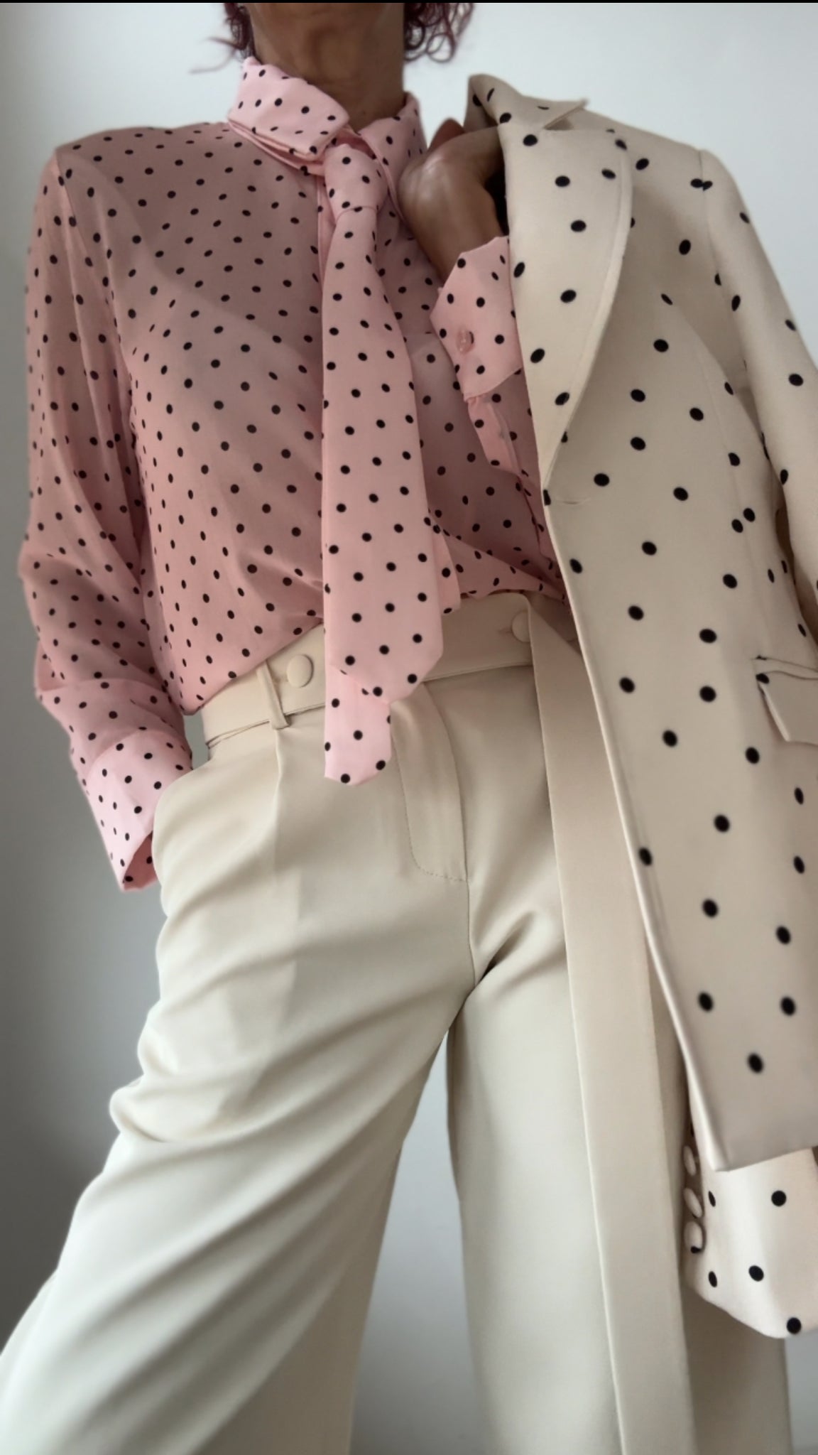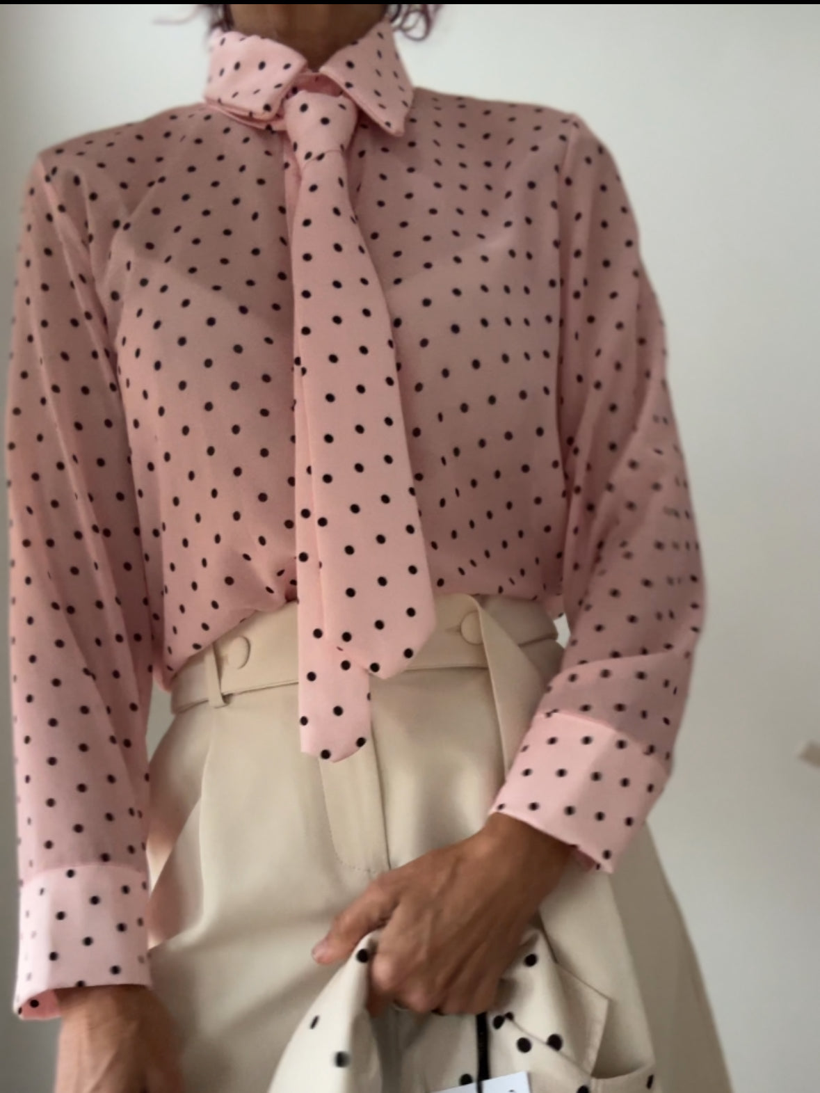 Camisa en tejido de gasa semitransparente en tono rosa bebé con lunar en negro