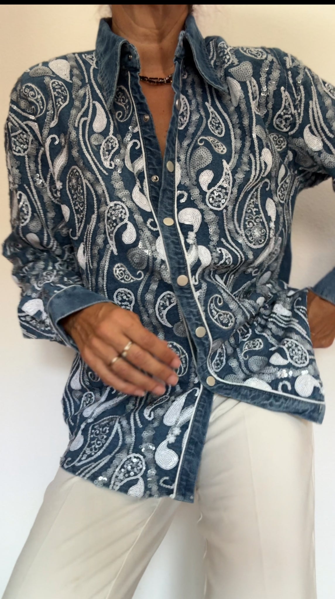 Camisa sobrecamisa o chaqueta en tejido vaquero bordada con lentejuelas blancas en mangas y delantero