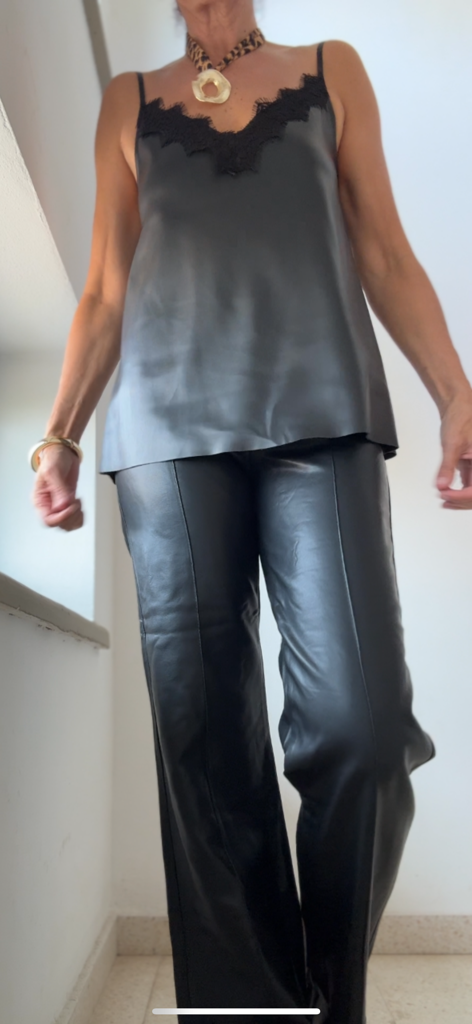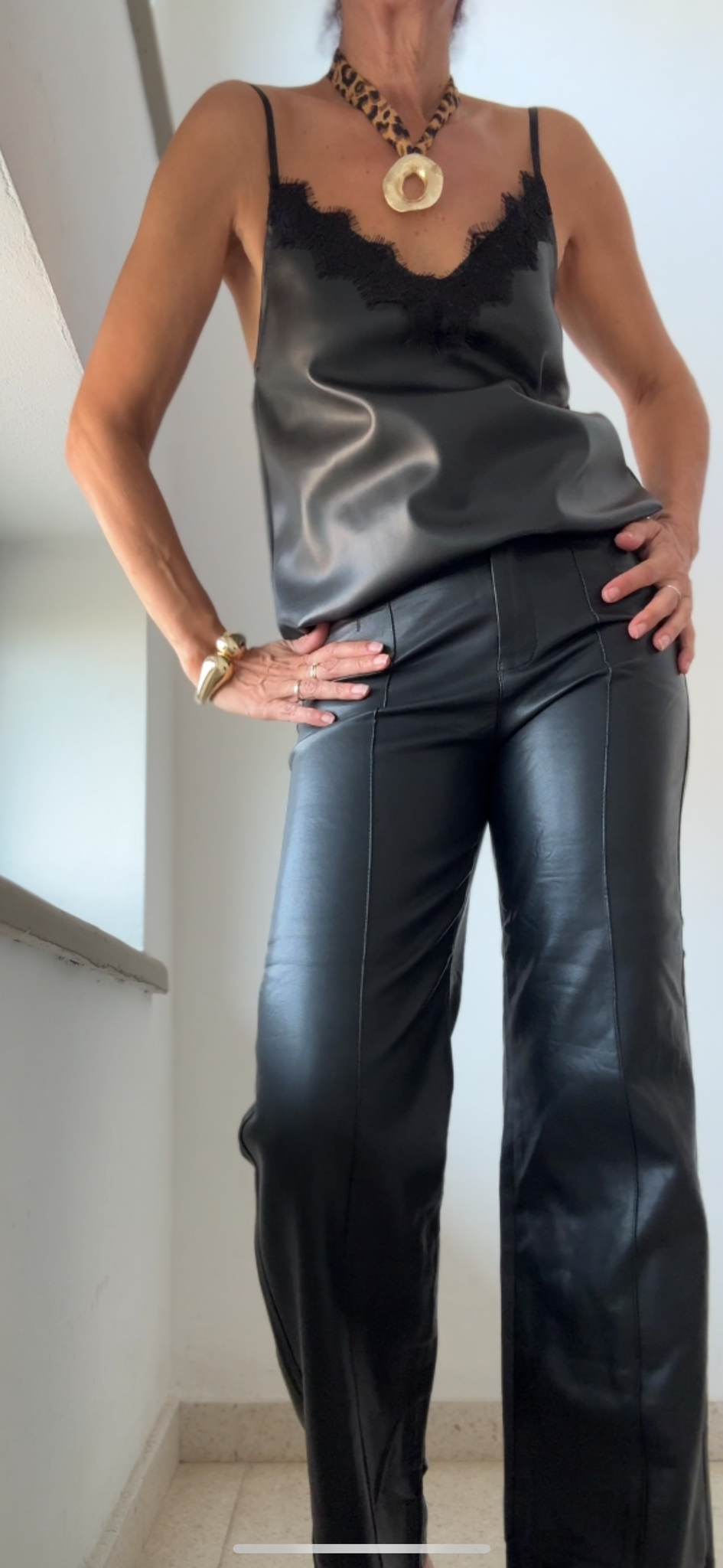 Top en tejido polipiel combinado con encaje en el escote y tirantas ajustables