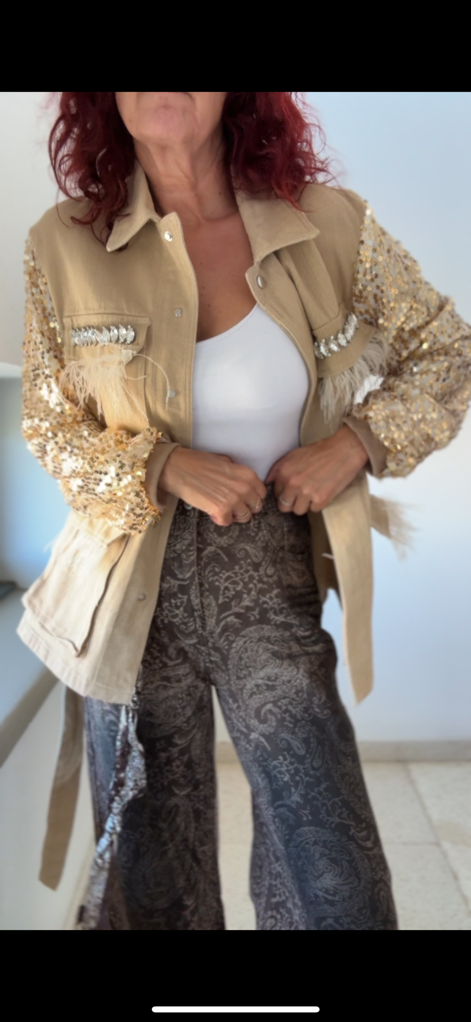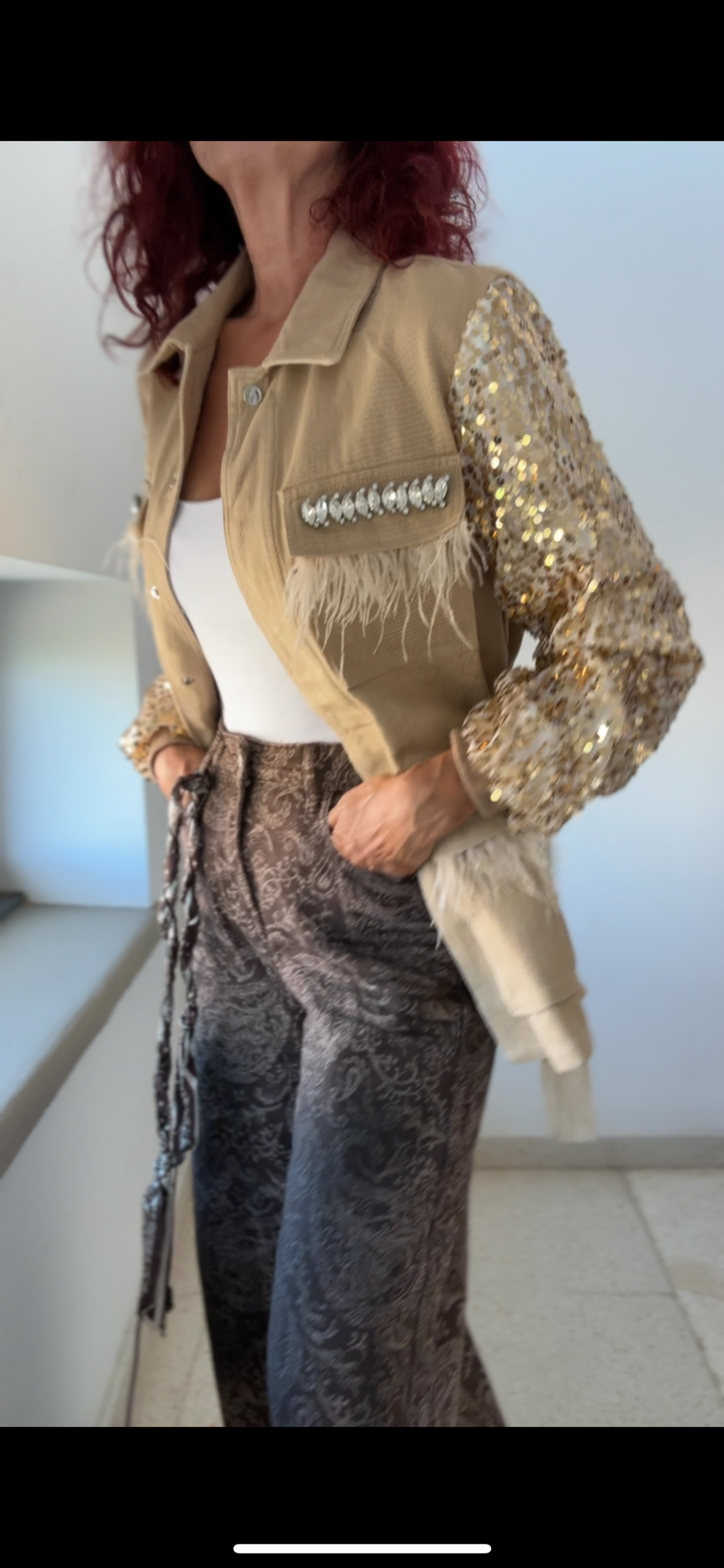 Chaqueta en tejido vaquero con aplicaciones en brillantes y pluma en los bolsillos y mangas en terciopelo y lentejuelas