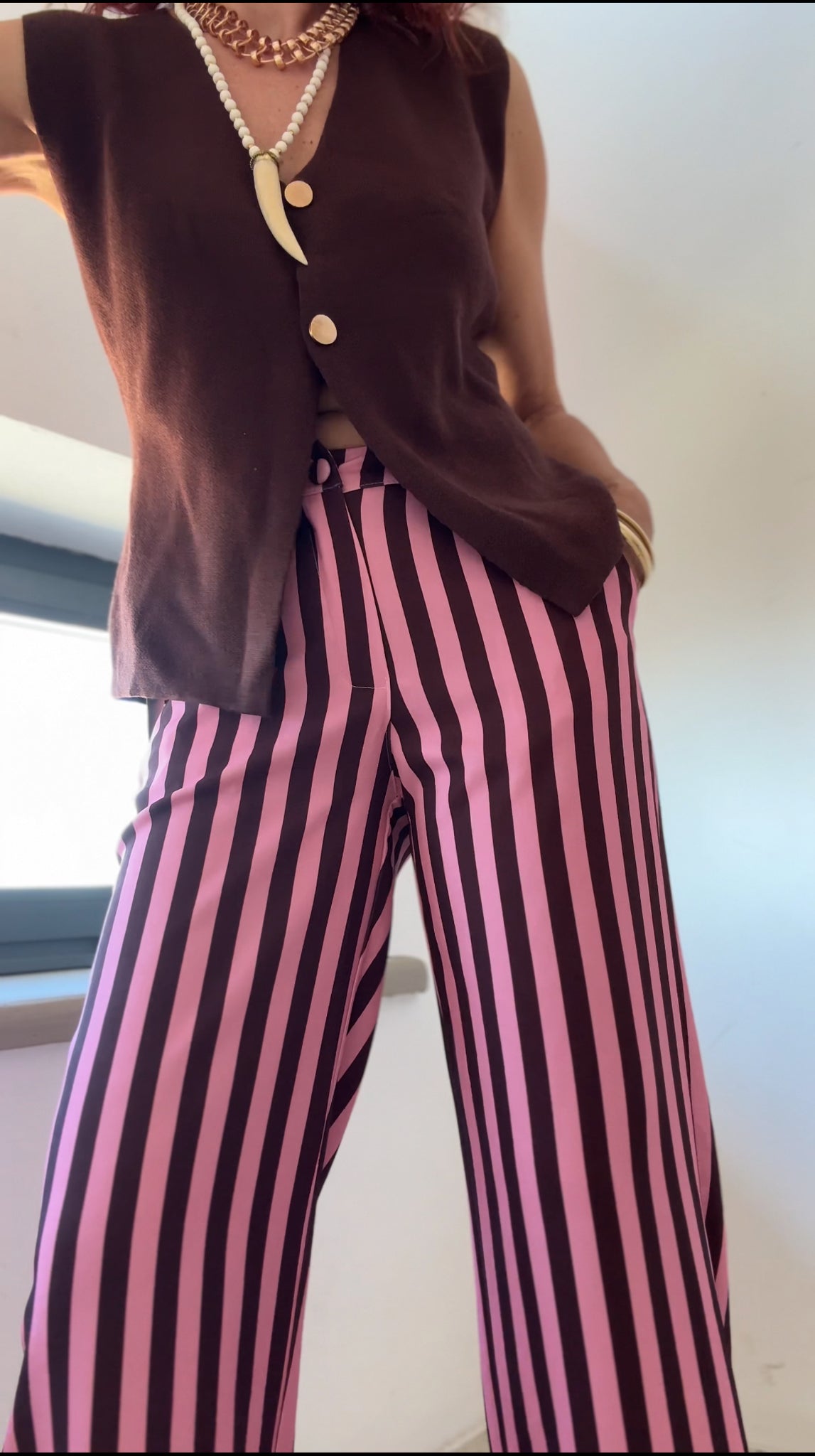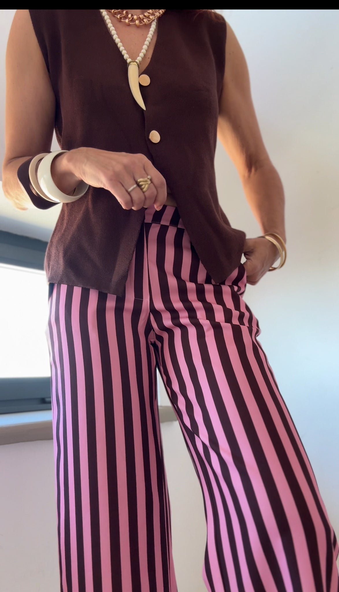 Chaleco de punto en marrón chocolate abierto delante con dos botones en dorado