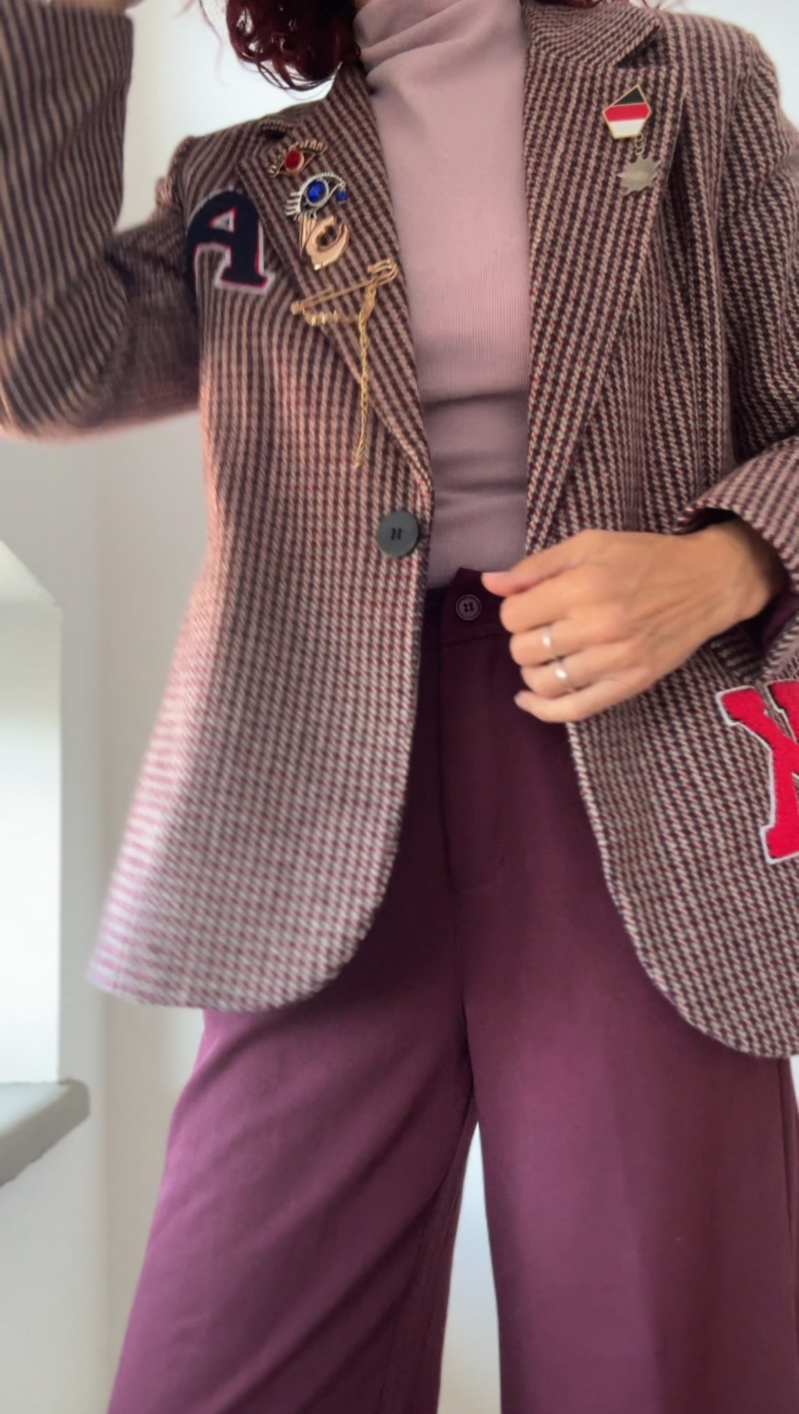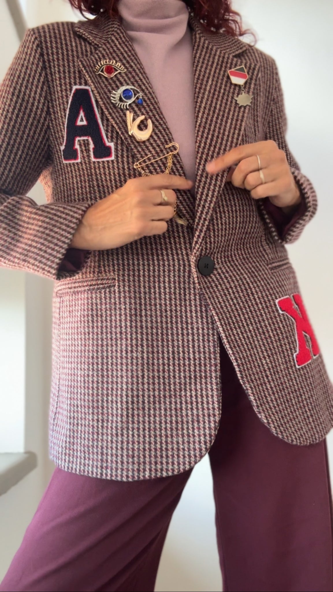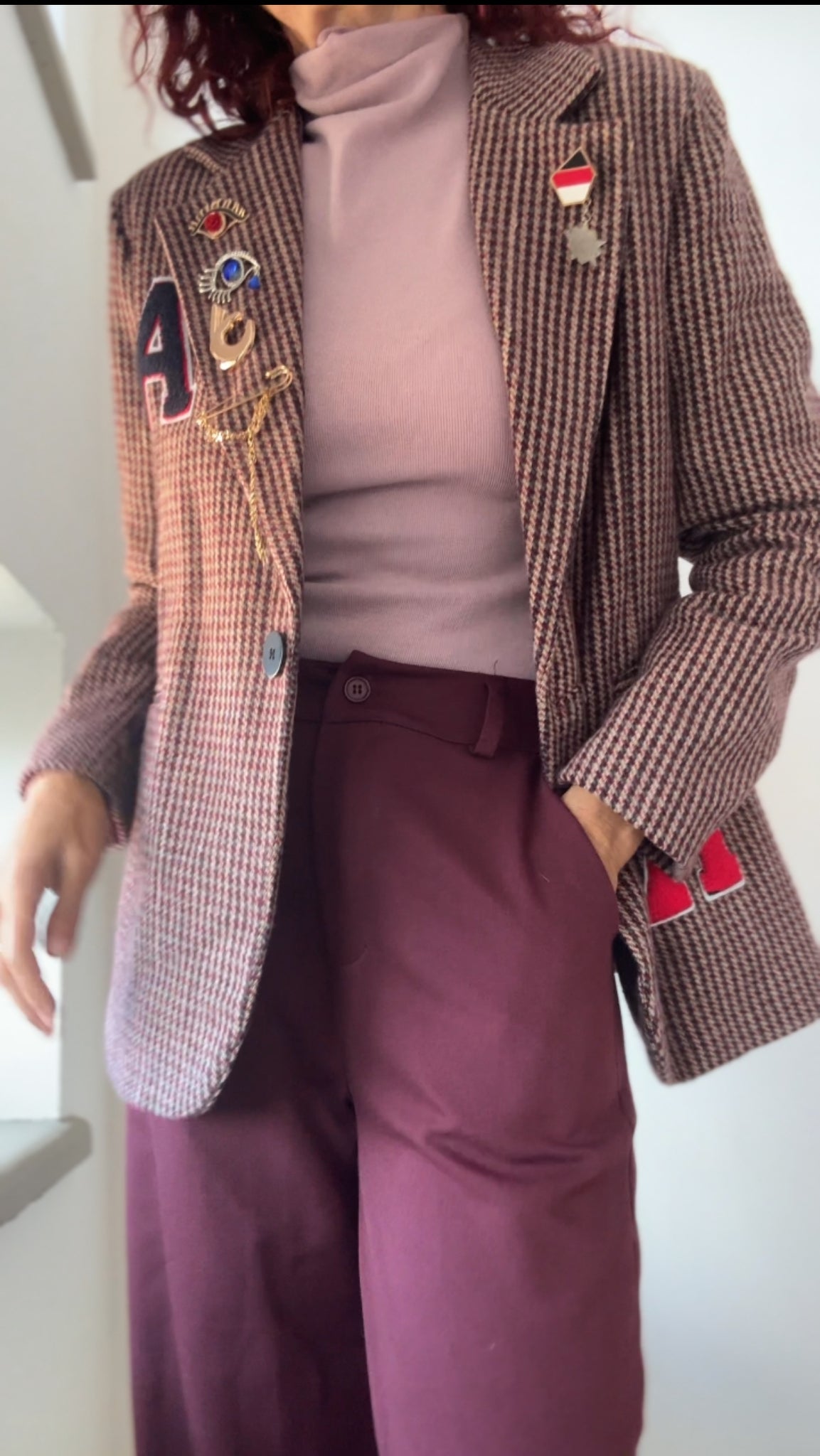 Chaqueta en cuadros pequeños parta de gallo tonos Burdeos crema y marrón