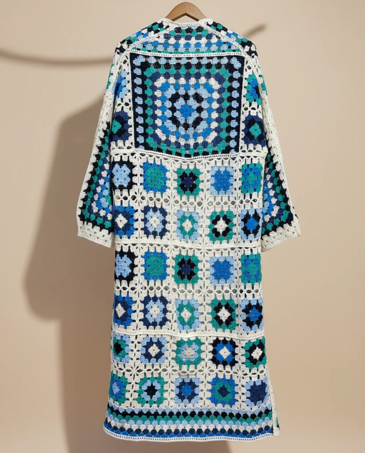 Kimono largo en ganchillo industrial con cuadrados granny squares en tonos azul, turquesa, verde agua y crudo. Espalda con patrón geométrico coordinado. Pieza estilo boho-chic.