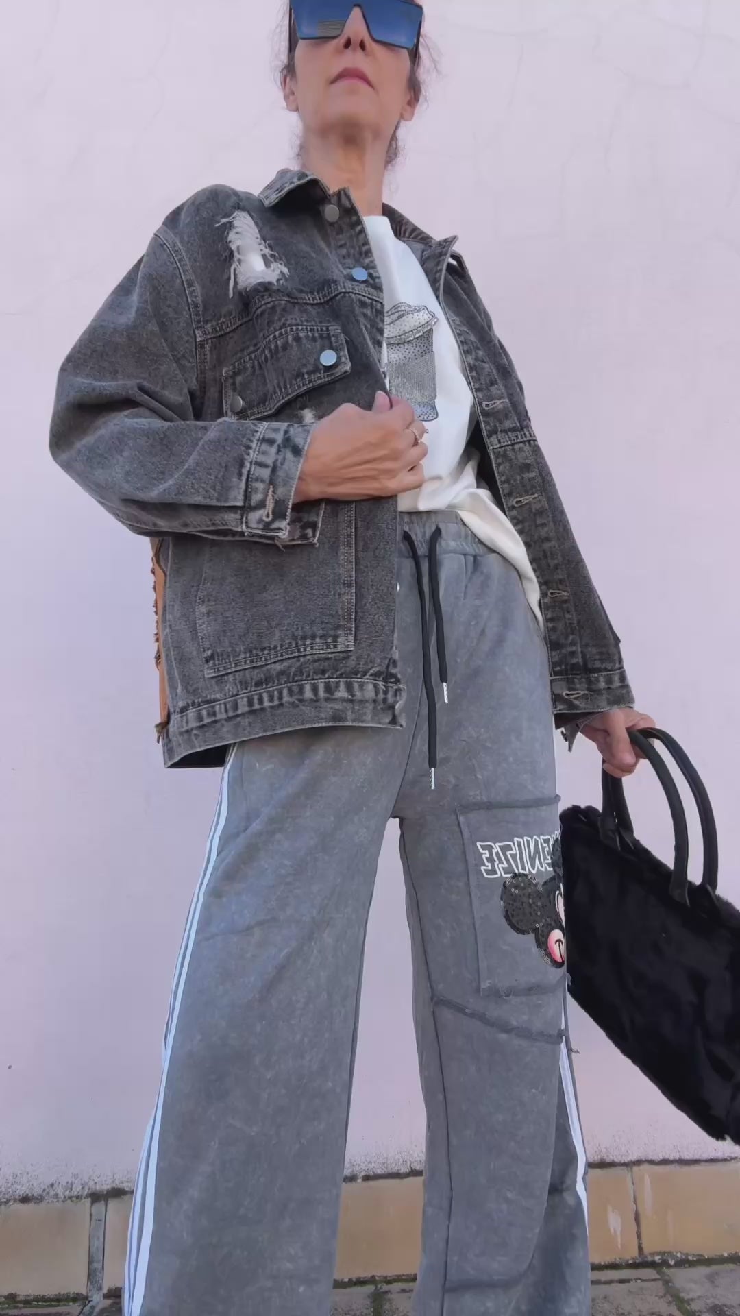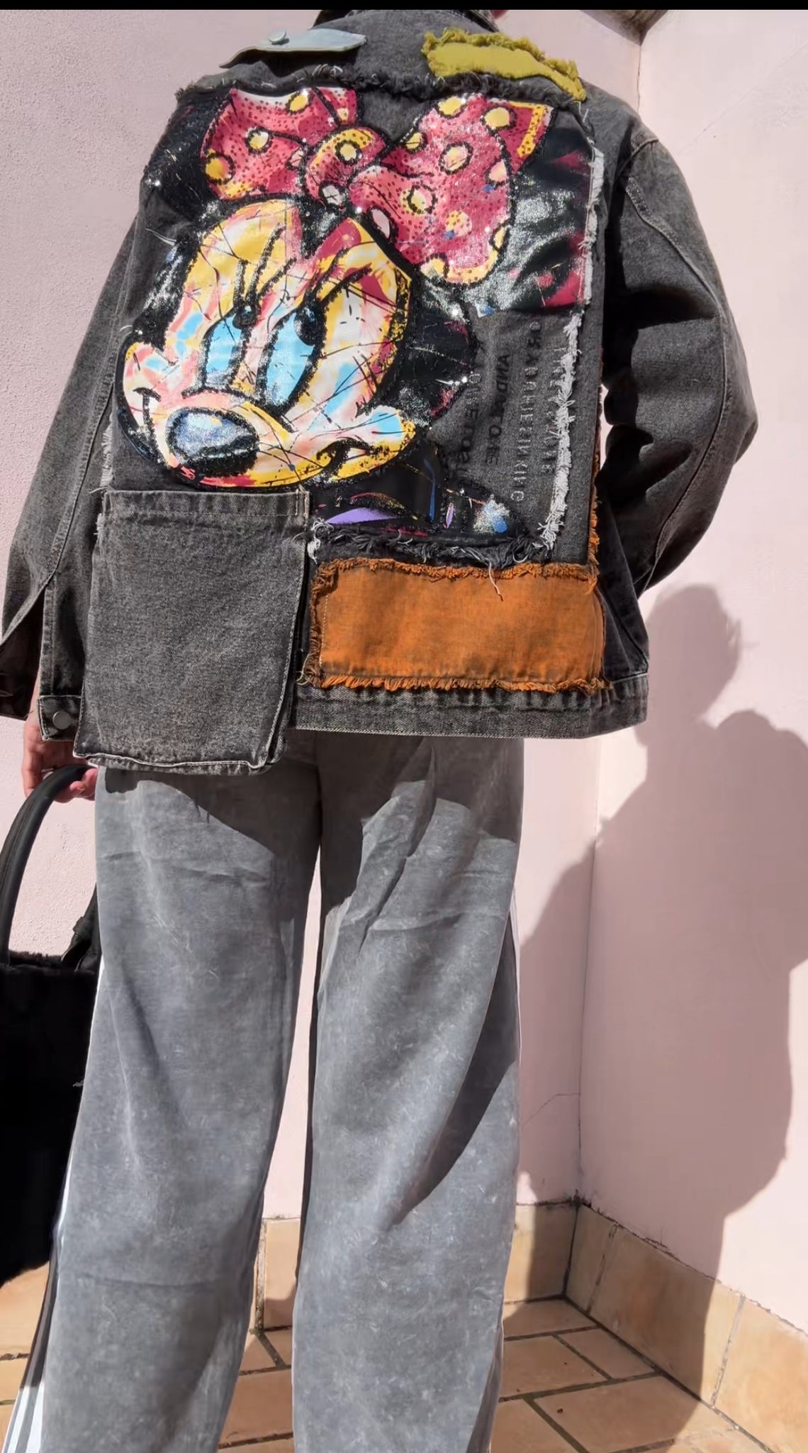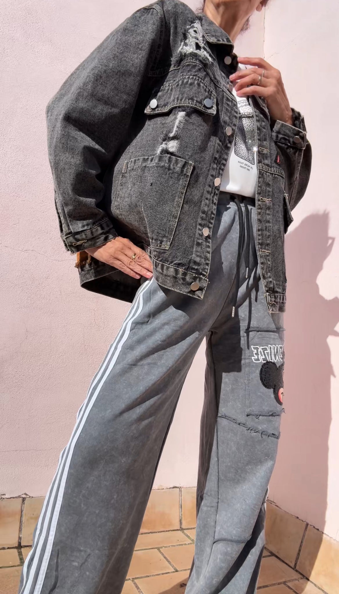 Pantalón en gris claro desgastado con detalle de líneas laterales y dibujo Mikey en pierna derecha