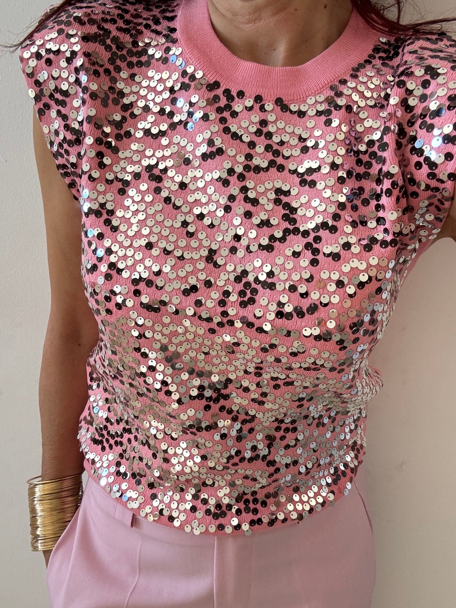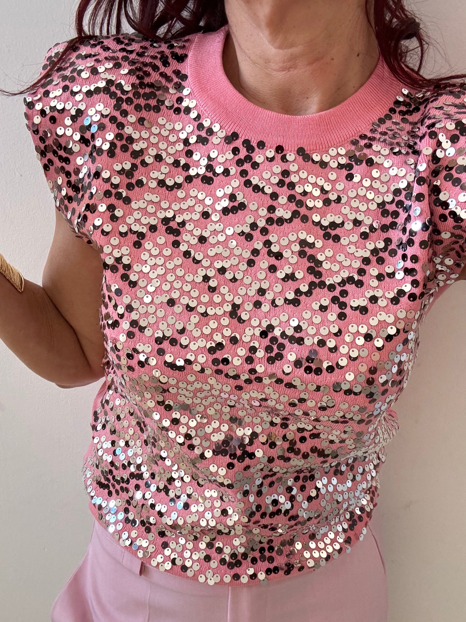 Top de punto rosa con lentejuela plateada en la parte delantera