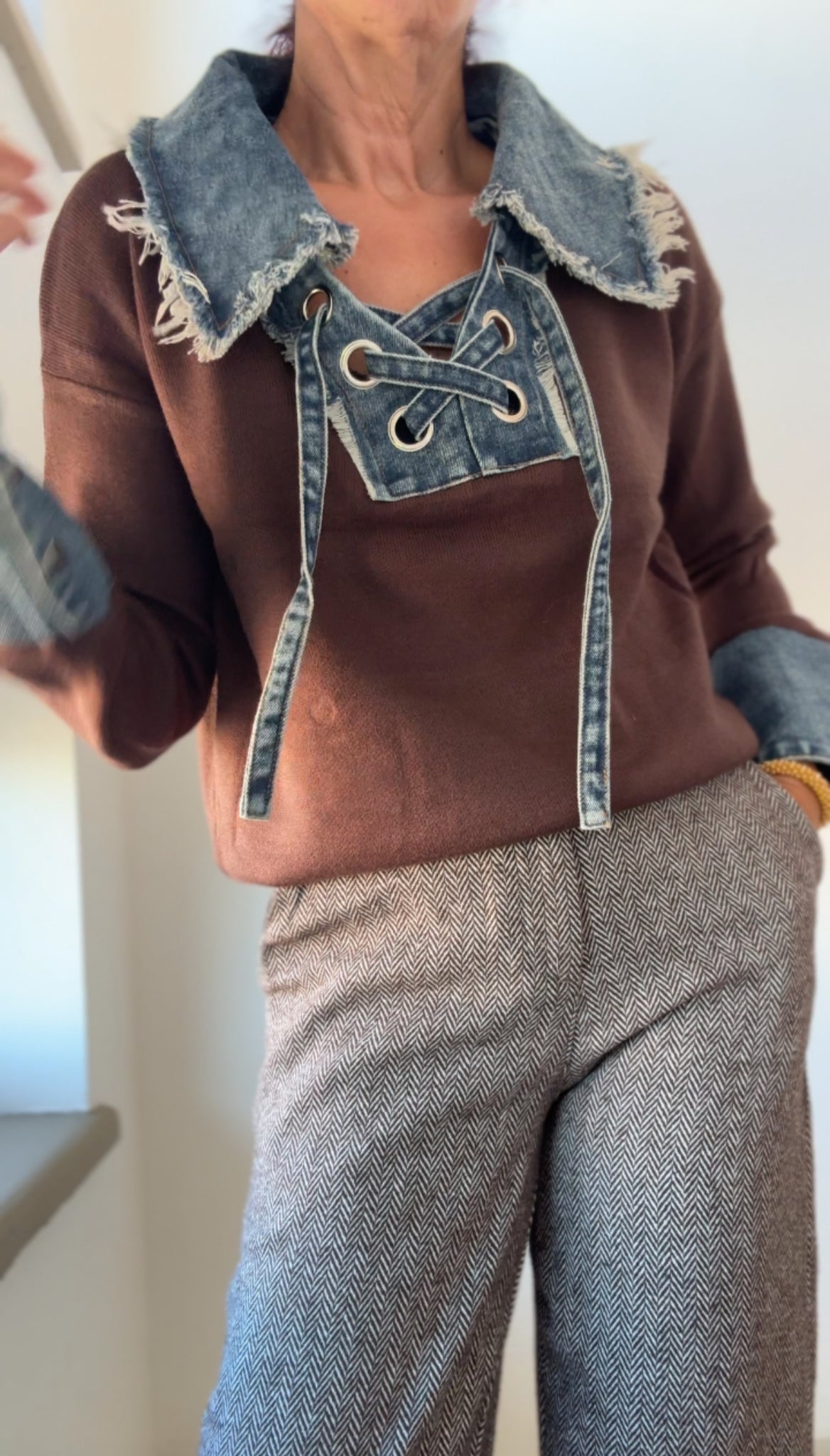 Pantalón en tejido lana con estampado en espiga marrón lleva botón y cremallera y bolsillos laterales pierna recta