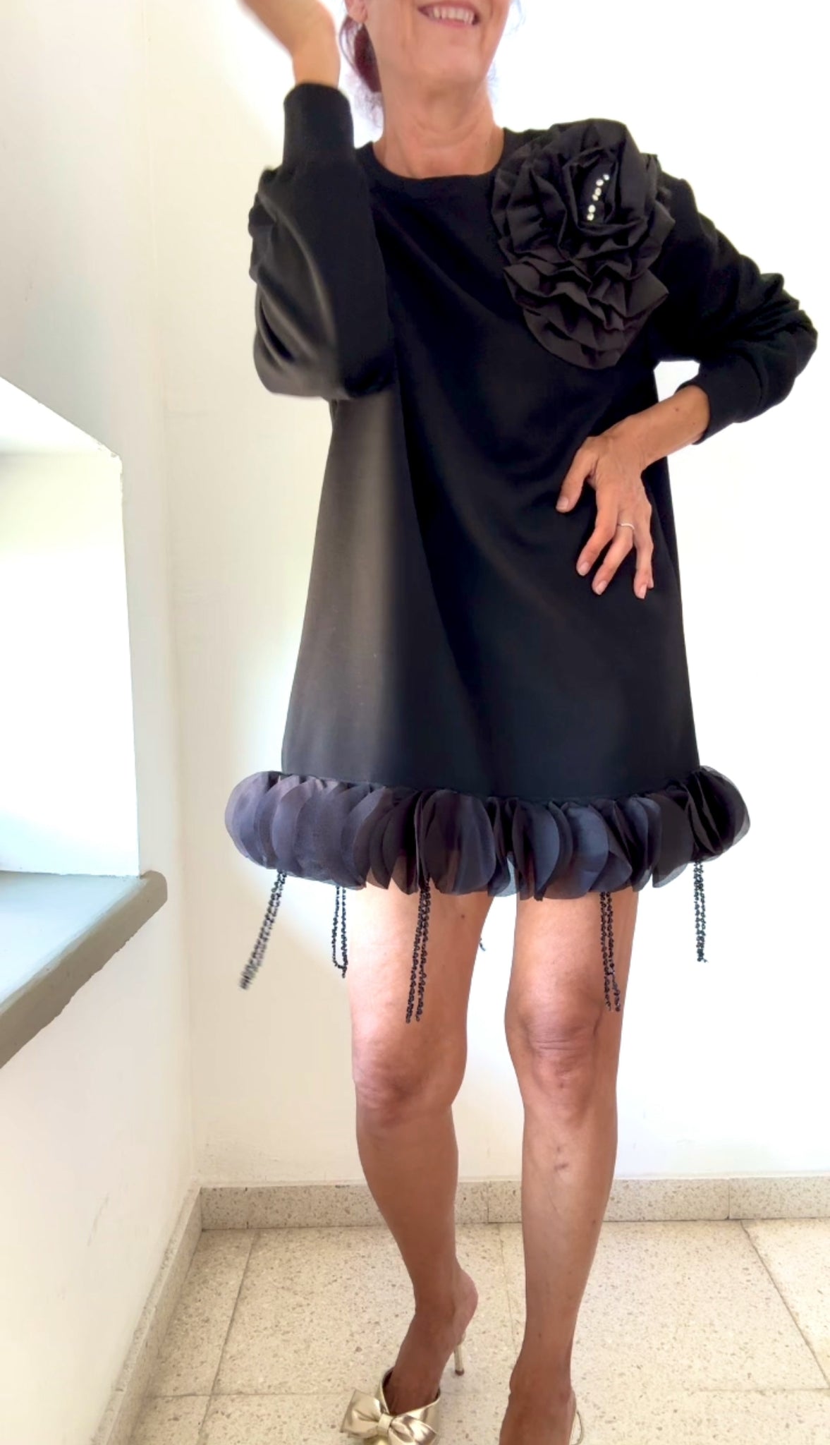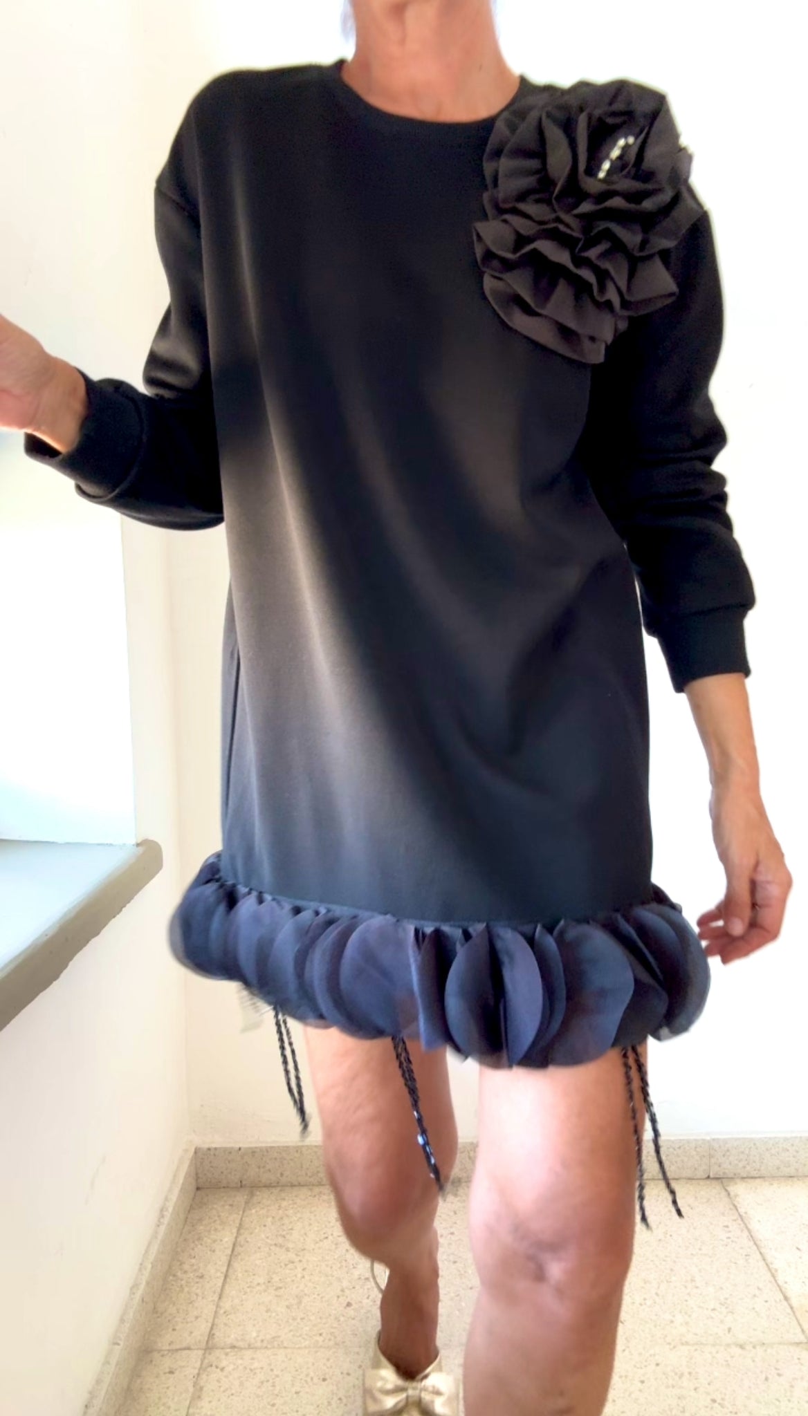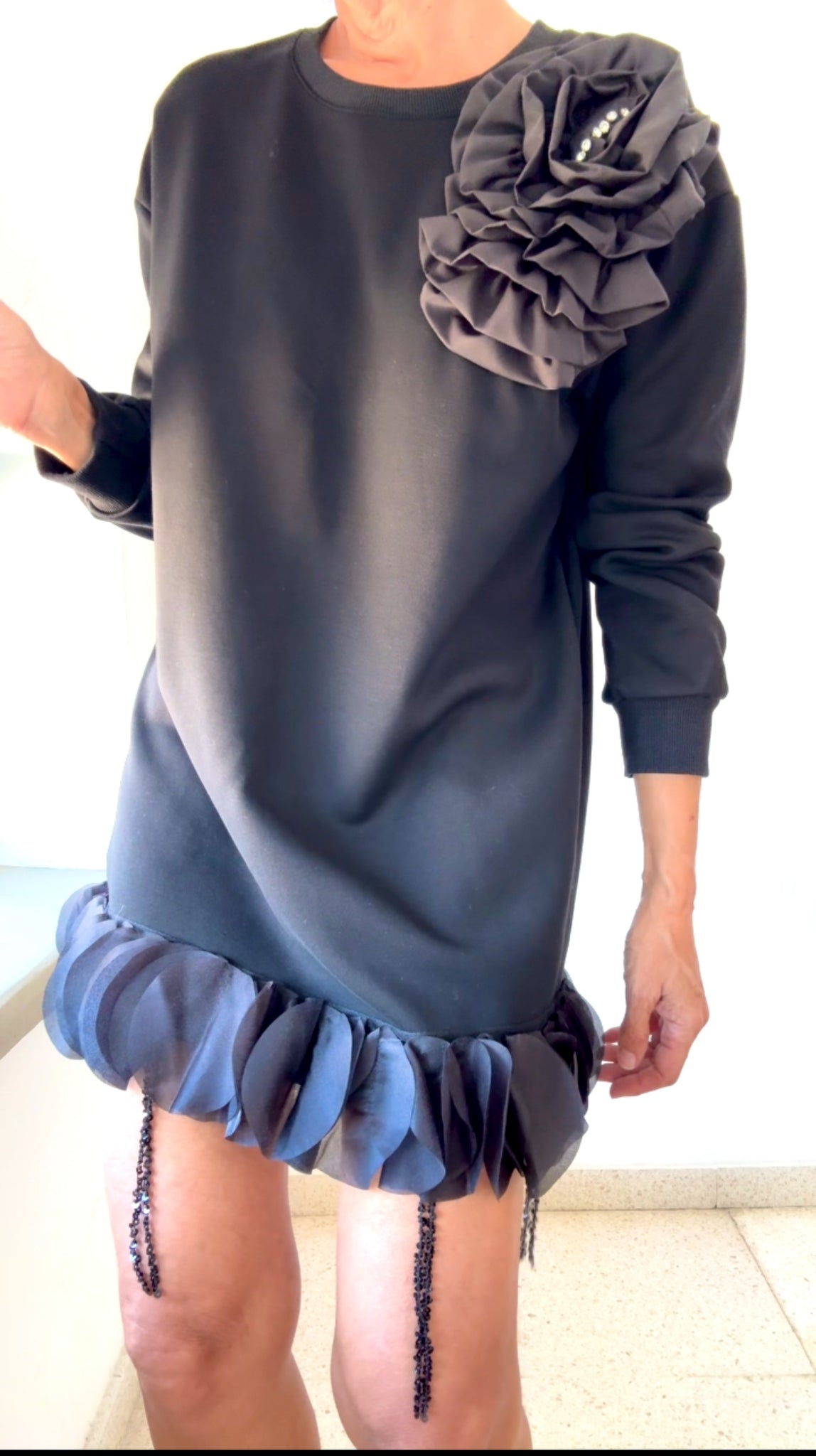 Vestido en tejido de sudadera con detalles en lentejuelas en el bajo y flor con centro de brillantitos
