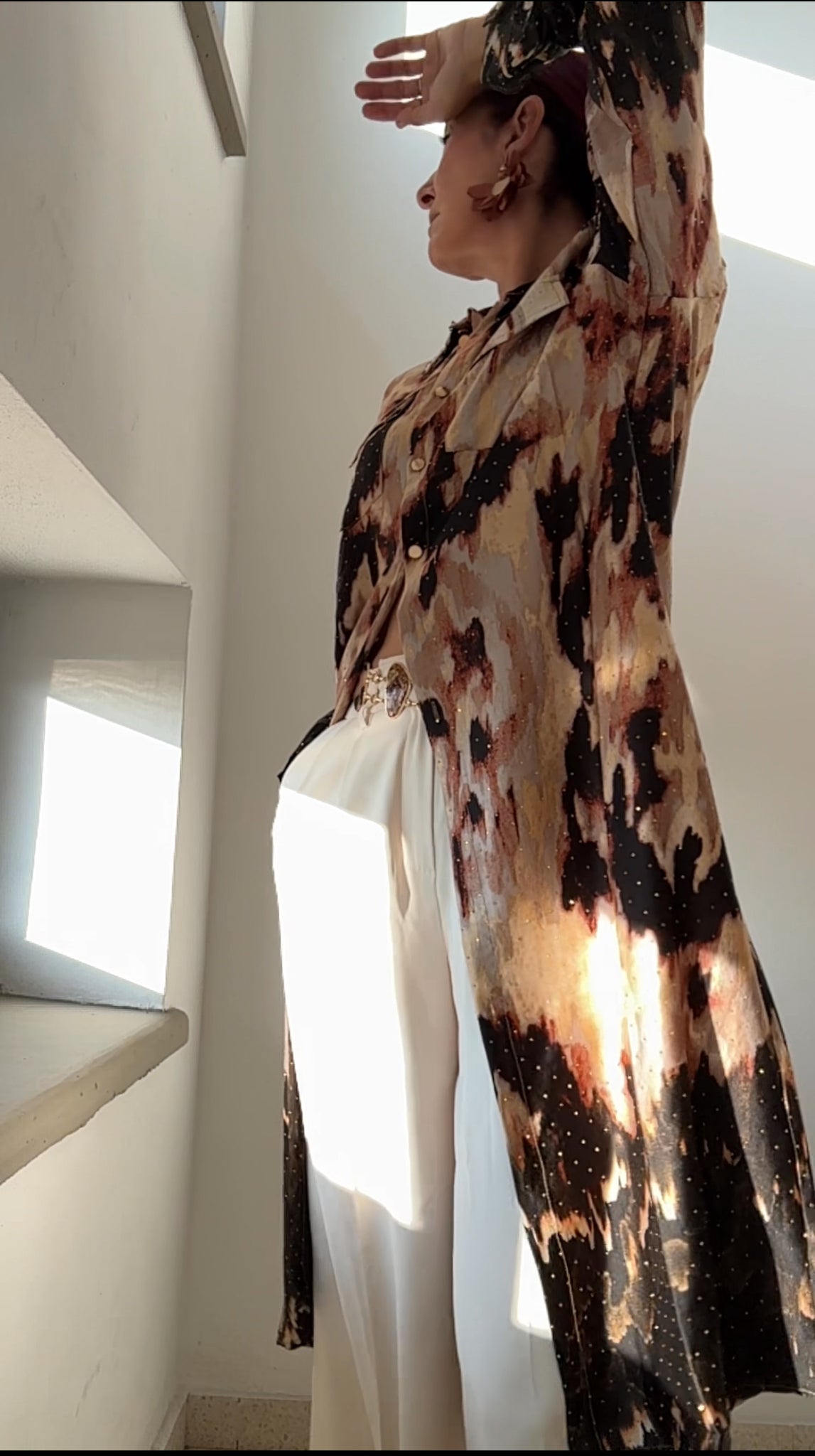 Vestido en tejido sedoso decorado con tachuelillas dorados y cuello con brillantes